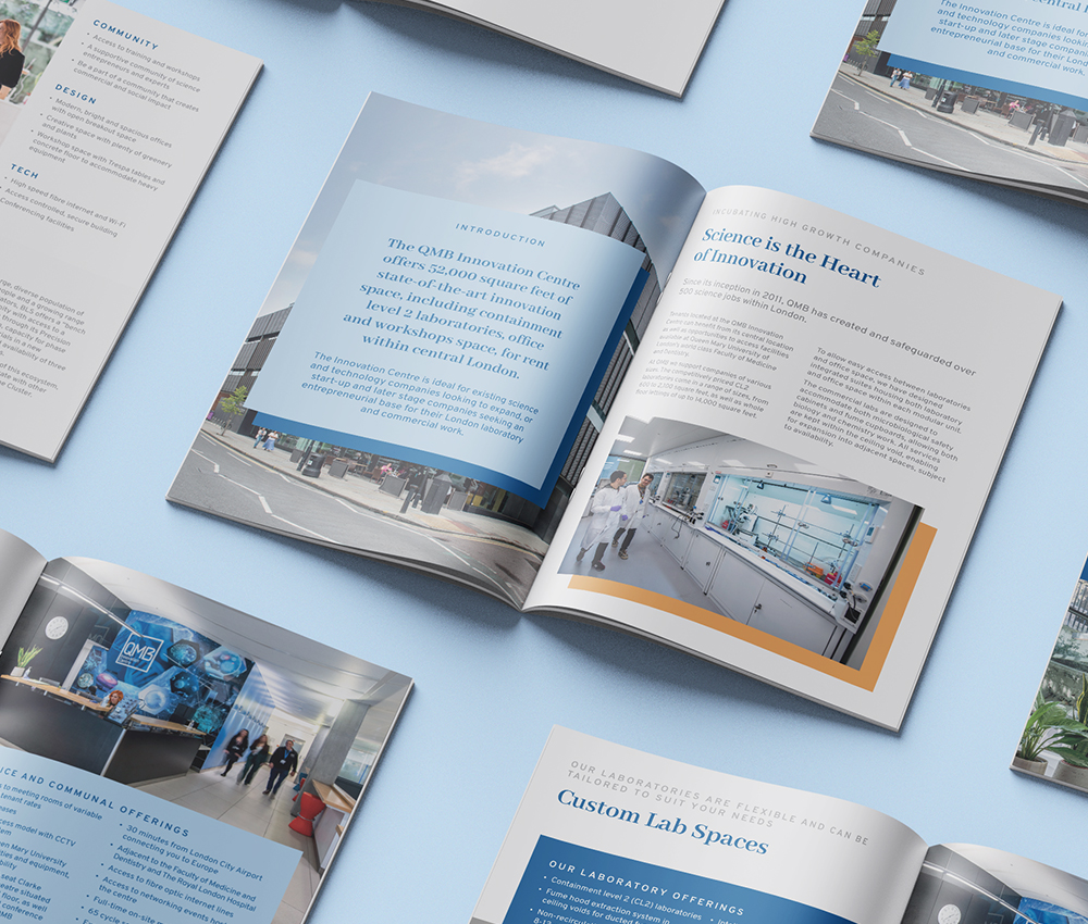 We partnered with Queen Mary Bioenterprises (QMB), a wholly owned subsidiary of Queen Mary University of London, providing 52,000 square feet of state-of-the-art innovation space, including containment level 2 laboratories, offices, and workshops for rent in central London. Having worked with QMUL on multiple projects, Identity Creative have supported the QMB Innovation Centre for over 10 years, creating materials that have grown and adapted alongside the centre.