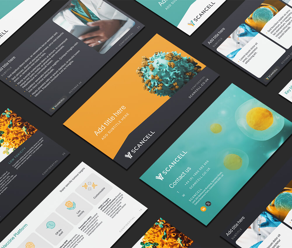 Identity Creative delivered a full logo suite and brand sheet for ongoing use internally and by external teams. Essential stationery and a bespoke PowerPoint template were developed to ensure a unified visual identity. A new website was designed and built with advanced functionality, intuitive navigation, and geofencing and filterable feeds to make all content easily accessible to the right audiences. We also provide ongoing support, producing scientific posters, presentations, social media images, and maintaining the website to reflect Scancell’s latest updates and resources.